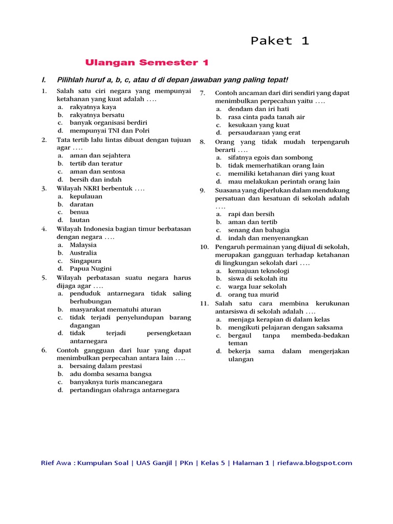 Kumpulan Soal Uas Ganjil Pkn Kelas 5