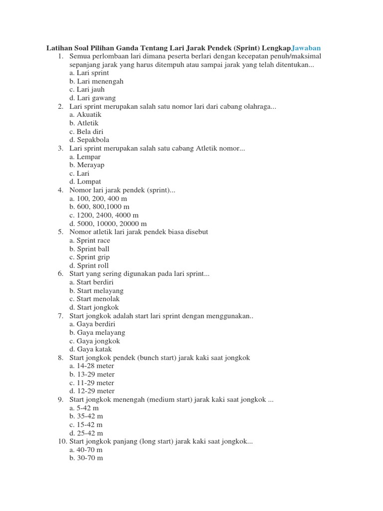 Sebutkan hal hal yang perlu dihindari dalam jalan cepat. 20171118 Latihan soal penjas tentang atletik dan jawabannya ini terdiri dari dua jenis soal yaitu soal pilihan ganda yang berjumlah 45 soal dan soal essay uraian dengan jumlah 5 soal. 2 日前 Kumpulan contoh latihan soal penjas kelas 11 tentang senam irama essay dan pilihan ganda dan kunci jawaban.