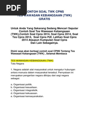 Memenuhi ambang batas SKD. CONTOH SOAL TWK CPNS TES WAWASAN KEBANGSAAN TWK GRATIS. Diharapkan dengan hadirnya fersi PDF ini lebih mudah dalam memahami soal-soal.